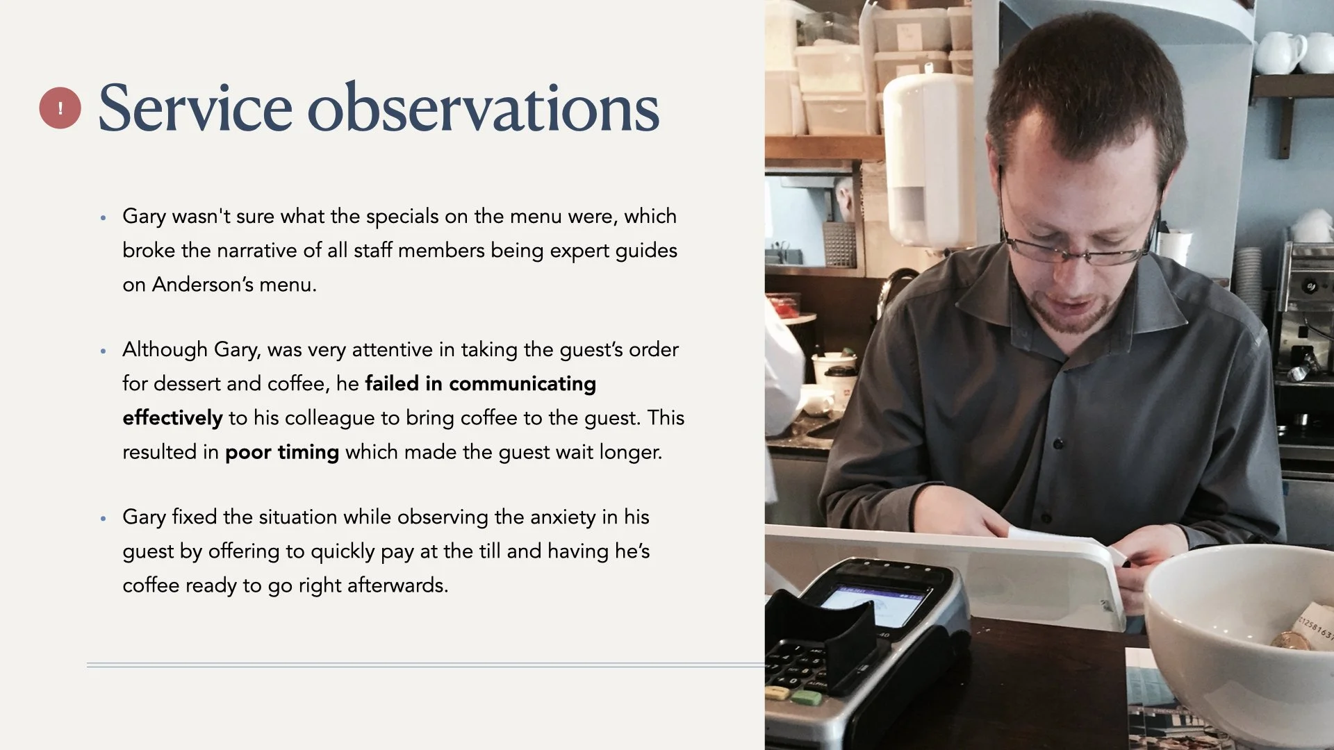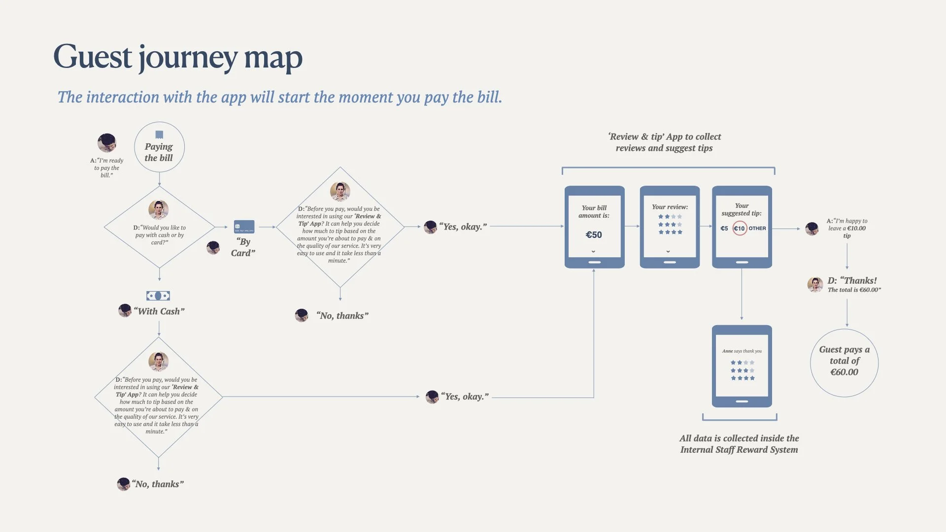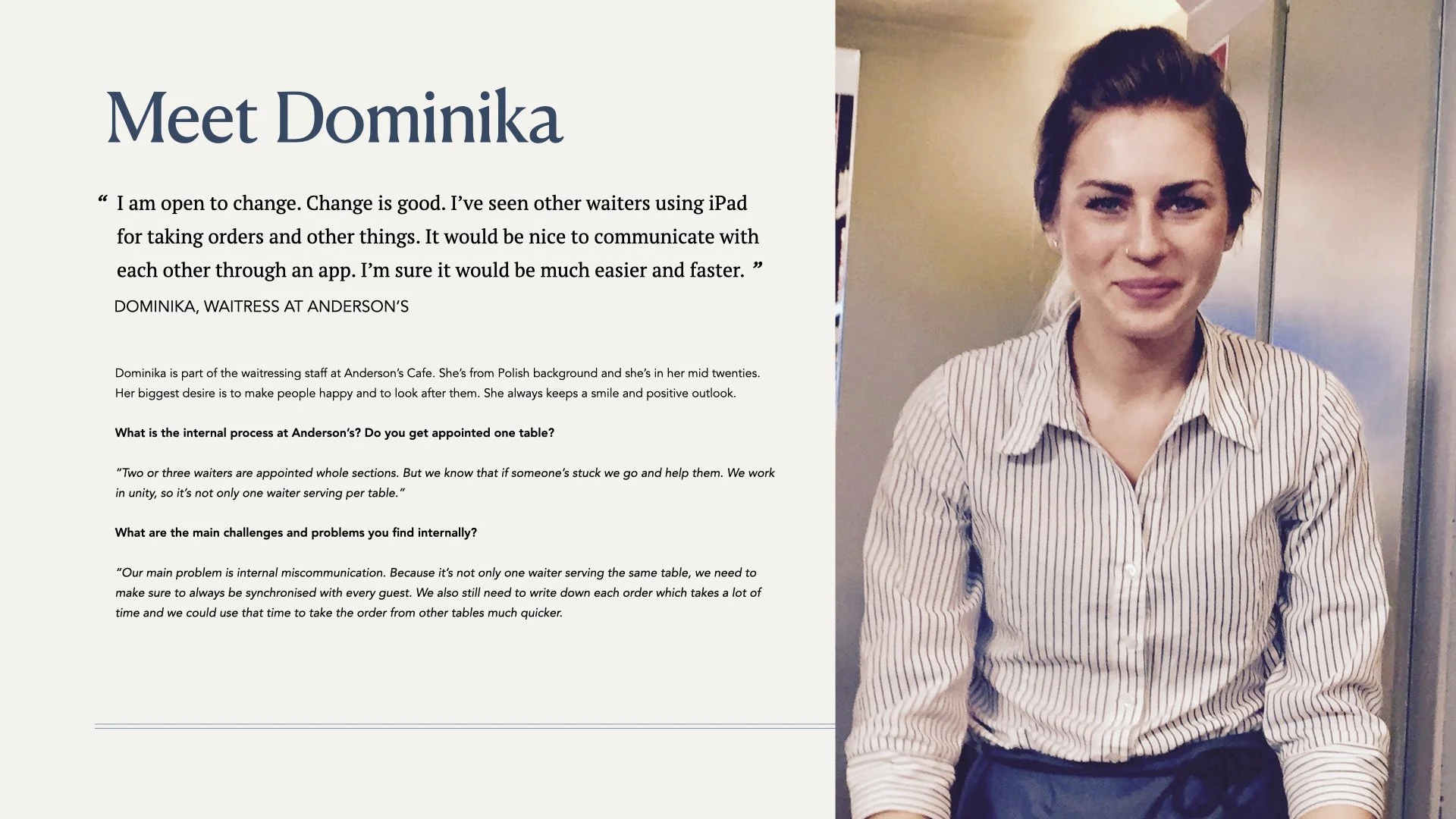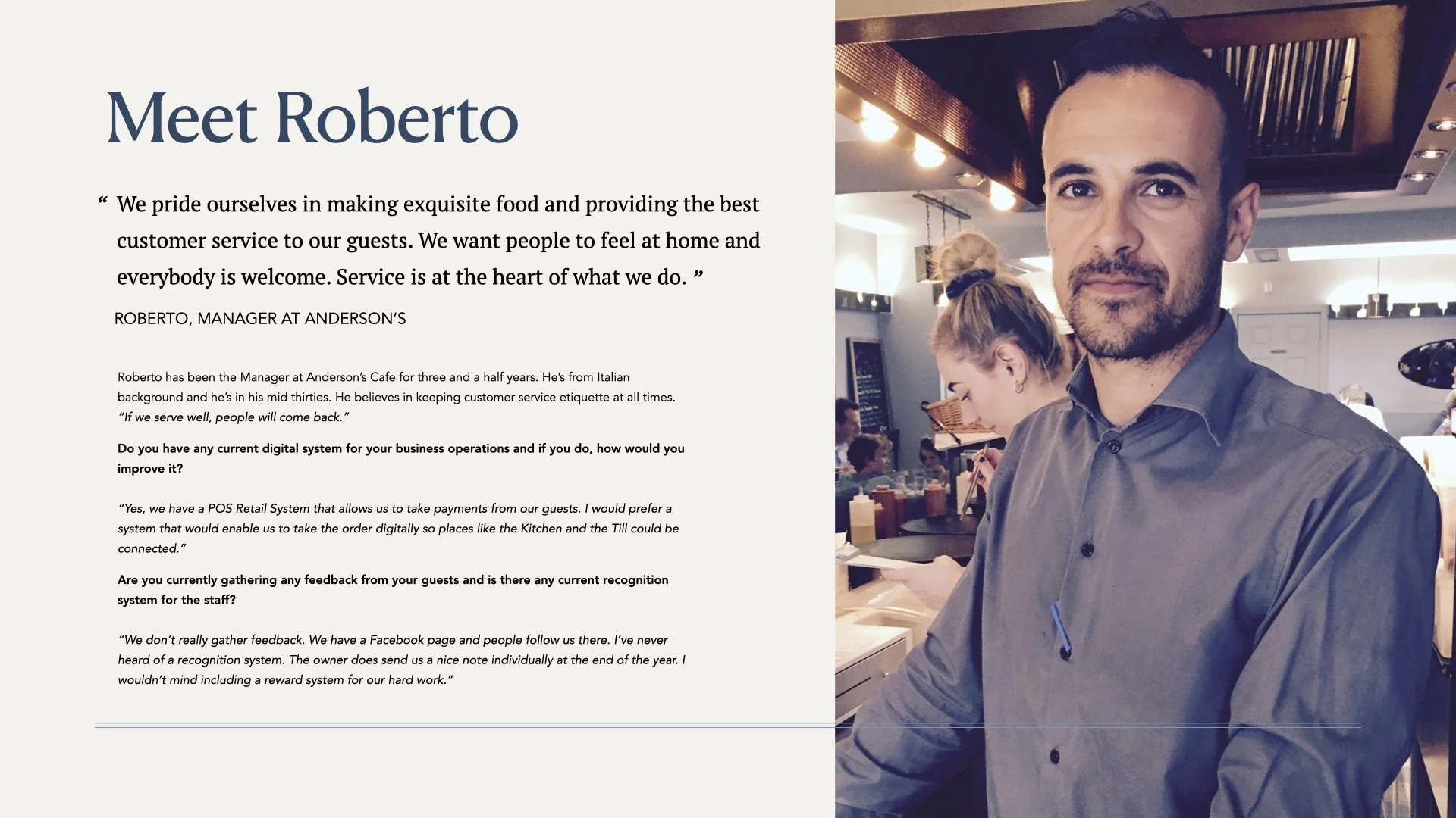 To gain deep insights into the dynamics of Anderson's Creperie, I conducted an in-depth ethnographic study. This involved analysing the physical space, observing how tips were collected, and studying staff interactions. During this process, I interviewed the manager, Roberto, and one of the staff members, Dominika, to construct basic personas for recognition. The study uncovered the need for a more seamless way for customers to express their appreciation for exceptional service.