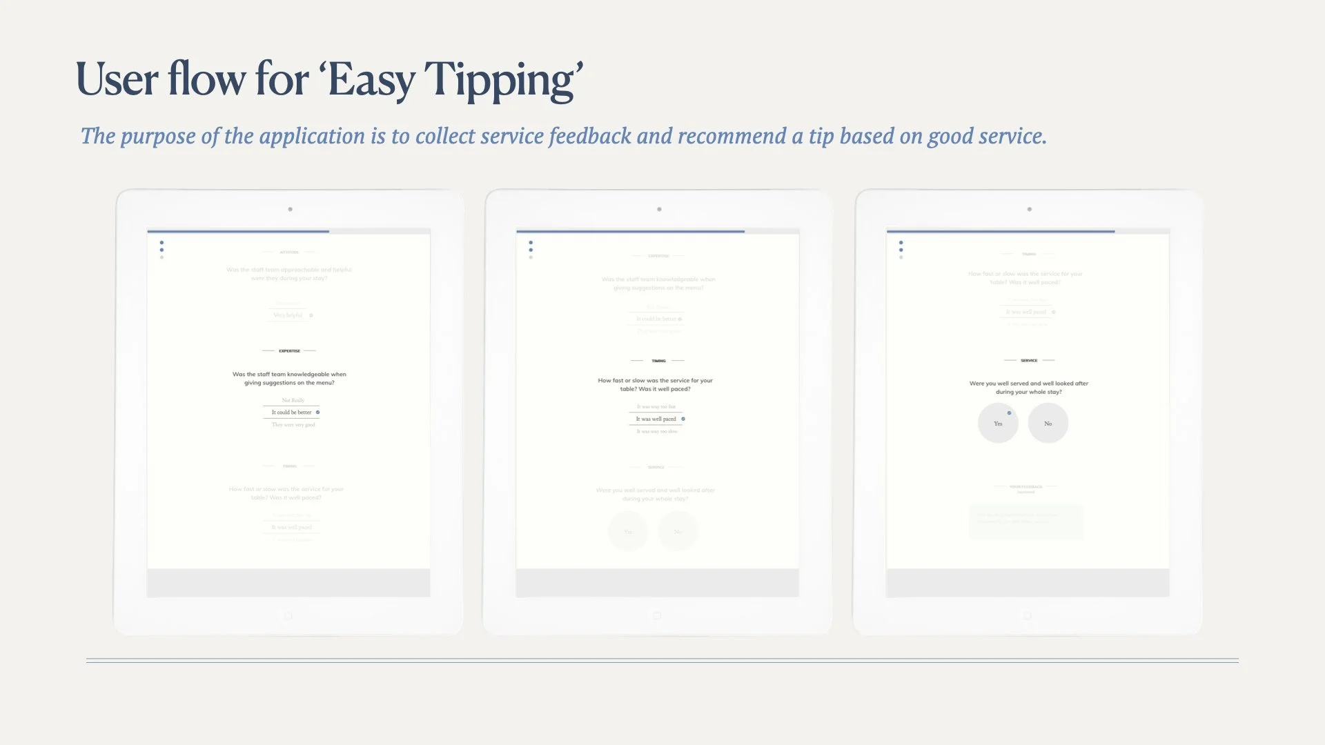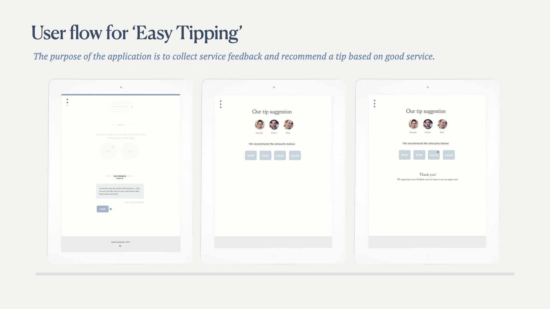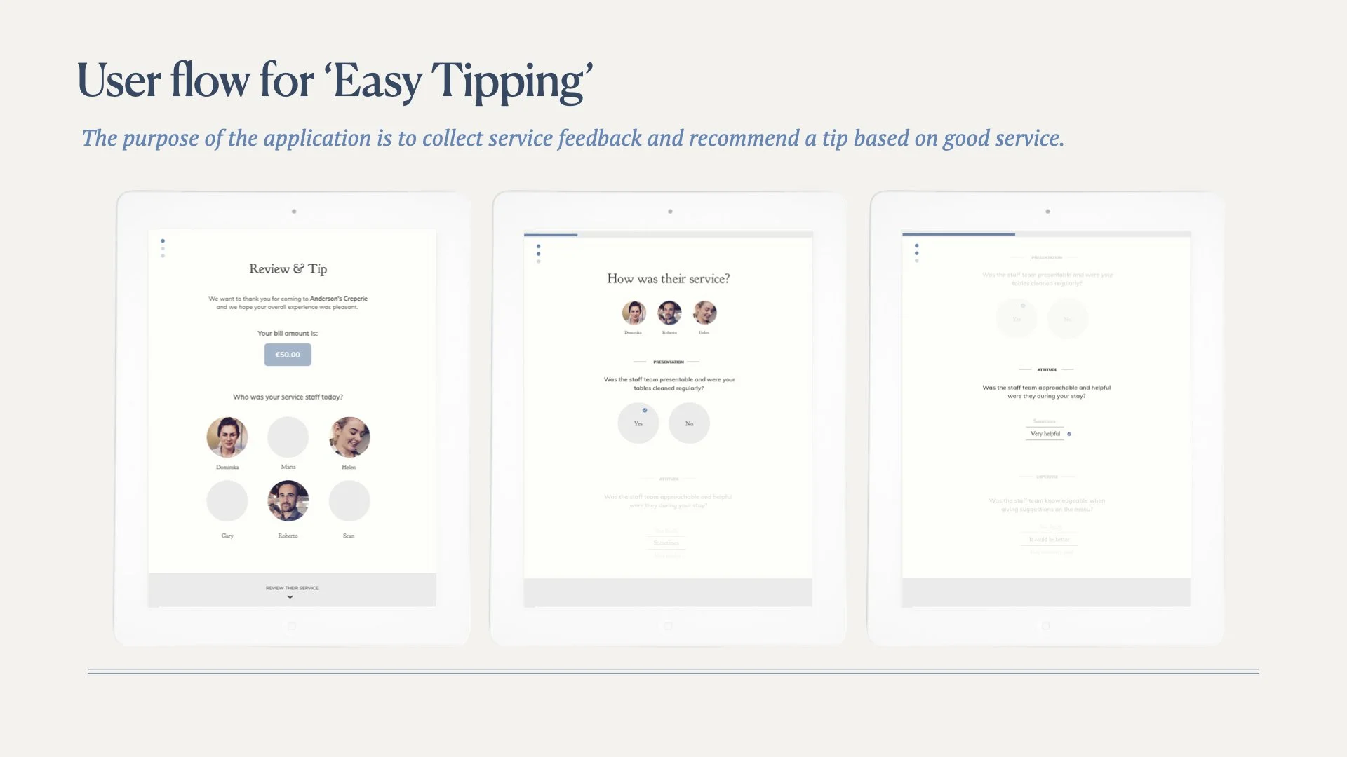 Anderson's Creperie, a beloved establishment located in the heart of Dublin City Centre, faced the challenge of improving recognition and appreciation for their hardworking staff through a more streamlined and user-friendly tipping system. As a Senior UX Designer, I embarked on a 24-hour UX challenge to create a concept for recognition in the hospitality industry. By conducting an ethnographic study, interviewing key stakeholders, and journey mapping the user experience, I developed an innovative tablet application called "Easy Tipping" to aid the tipping process and enhance the overall service experience.