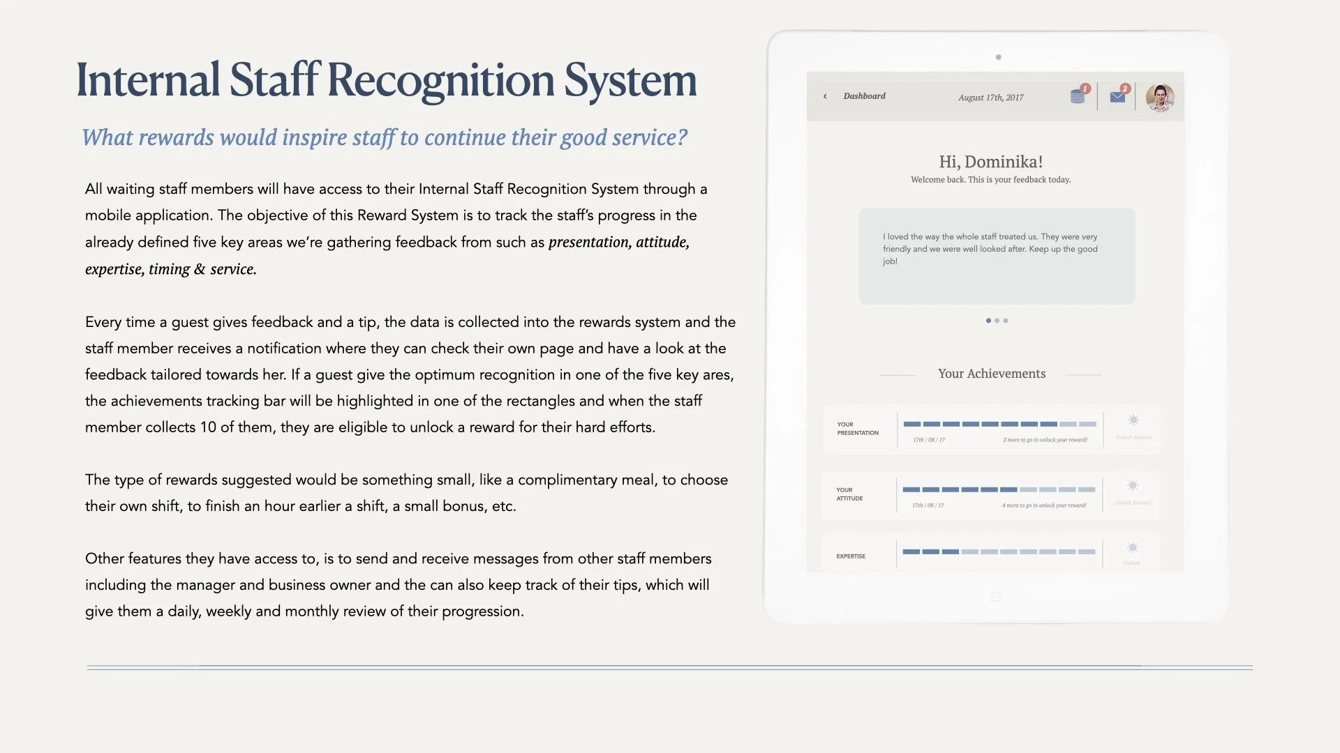 The concept successfully addresses the challenge of enhancing recognition and appreciation for hardworking staff, resulting in a more satisfied customer base and a positive impact on the overall dining experience.