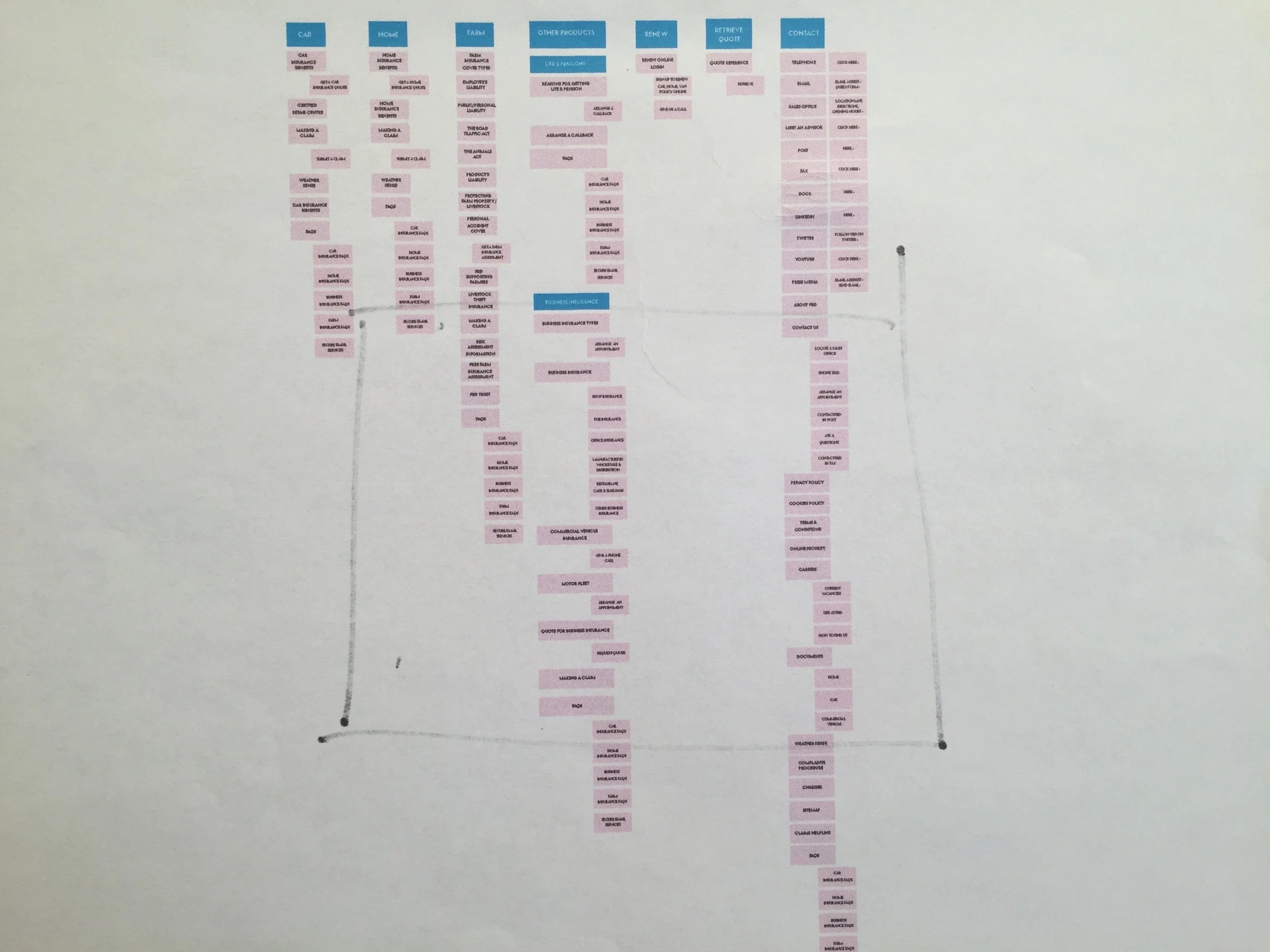 Card Sorting: To restructure the site navigation, we conducted card sorting exercises with the current site menu items and additional items required for the new insurance products. The results revealed a natural grouping for three main categories: Persona, Farm, and Business.
